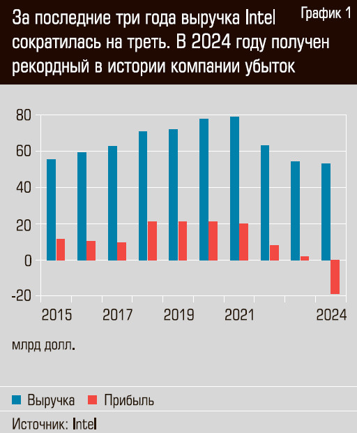 Итоги 2024 года оказались для Intel обескураживающими: выручка снижалась третий год кряду и упала до 53,1 млрд долларов — это на треть меньше, чем в 2021 году; более того, компания получила рекордный за всю свою историю убыток в 18,8 млрд долларов. Немудрено, что от компании отвернулись инвесторы — с капитализацией в 109 млрд долларов она сегодня лишь семнадцатая в ренкинге самых дорогих электронных корпораций мира.