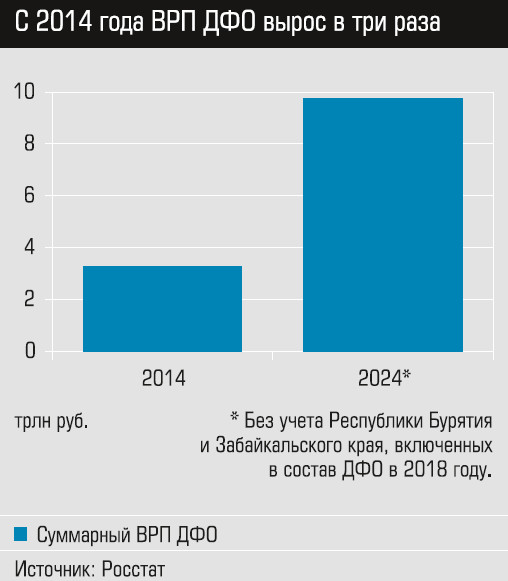 Точных цифр он не назвал, но реальный рост может быть даже выше. По данным Росстата, с 2014 по 2024 год ВРП девяти регионов Дальневосточного федерального округа вырос в три раза — с 3,2 трлн до 9,7 трлн рублей.