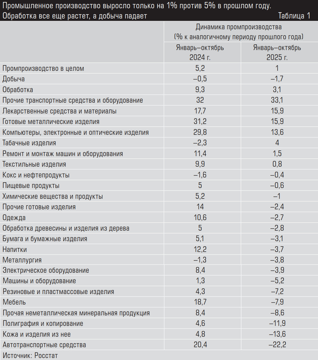 Как видно из таблицы 1, ситуация с динамикой производства в 2025 году значительно ухудшилась как в целом, так и в большинстве отраслей: многие перешли от роста к сокращению производства. Хорошие показатели остались преимущественно в секторах, находящихся под большим влиянием ВПК. В частности, в «прочие транспортные средства и оборудование» входит военная техника, в «готовые металлические изделия» — боеприпасы, в «компьютеры, электронные и оптические изделия» — дроны и их комплектующие. С лекарственными средствами и материалами ситуация чуть лучше, они все-таки не только военным нужны, в России в этой сфере активно продолжается импортозамещение.