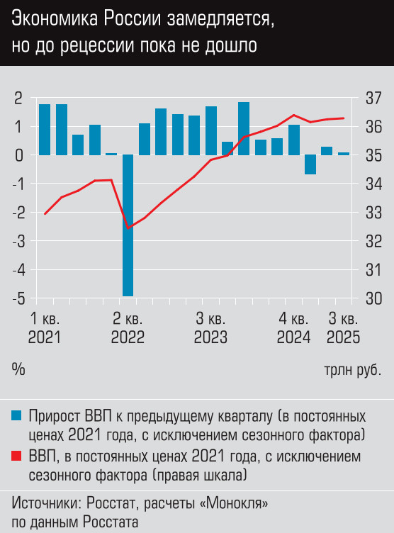 Если рисовать состояние экономики широкими мазками, то этот год проходит под знаком паузы — производственной и инвестиционной. Удержаться от рецессии удалось, но замедление продолжается. По прогнозам, в целом за 2025 год мы вполне можем выйти на рост ВВП, близкий к 0,9%, а в 2026-м — от 0,5 до 1,5%. Что важно, в прогнозы на будущий год заложено умеренное снижение ключевой ставки, и если ЦБ по какой-то причине будет тянуть с этим, то рост может быть и меньше.