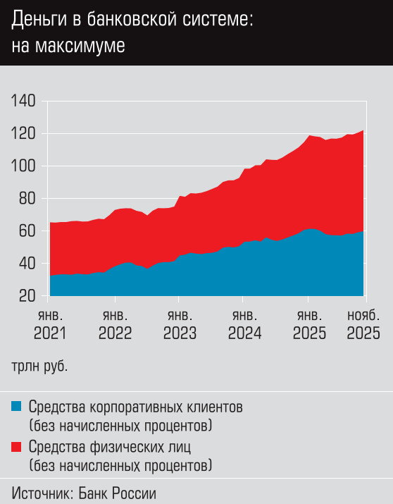 Нельзя сказать, что в экономике нет денег. Например, по оперативным данным Росстата, объем инвестиций за январь– сентябрь 2025 года составил 20,8 трлн рублей. В то же время на 1 ноября средства на счетах и депозитах (без учета начисленных процентов) компаний, по данным ЦБ, составили 59,8 трлн рублей, на счетах и депозитах физических лиц — еще 62,2 трлн рублей.
