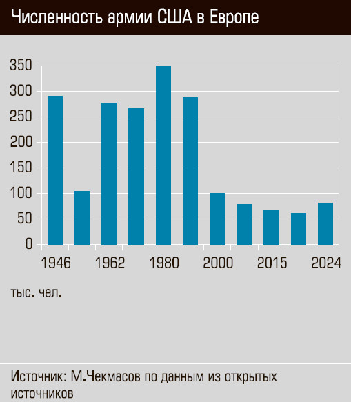 К тому времени численность войск США в Европе стала резко расти (см. график), и функция коллективной обороны была на несколько десятилетий всецело делегирована Североатлантическому альянсу. В начале 1950-х было создано Европейское командование США, в которое вошли армия (USAREUR), ВВС (USAFE) и ВМС (USNAVGER). Своего пика по численности войск и ресурсов оно достигло в 1980-х годах, затем она пошла на спад. Исторический минимум пришелся на 2017 год. Последовавший за ним разворот (рост на 20 тыс. военнослужащих за пять лет) связан с событиями на Украине.