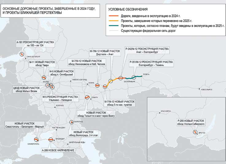 В 2024 году продолжалось развитие коридора «Запад — Восток» за счет завершения крупных инфраструктурных проектов (см. карту 1). К ним относится открытие обхода Малых Вязем на ЦКАД, после чего кольцо замкнулось. Закончено обустройство трассы М-11 «Нева»: в середине лета ввели второй участок обхода Твери. Тем не менее план по вводу дорог ГК «Автодор» на 2024 год (почти 350 км) выполнен не был: в декабре 2024 года на М-12 предполагалось ввести в эксплуатацию участок Дюртюли — Ачит протяженностью 275 км (трасса Казань — Екатеринбург), но этого не произошло. В целом ситуация некритична: проект будет реализован, просто открытие перенесено на 2025 год. А значит, в этом году план будет перевыполнен: вместо чуть более 40 км платных дорог будет введено более 300 км.