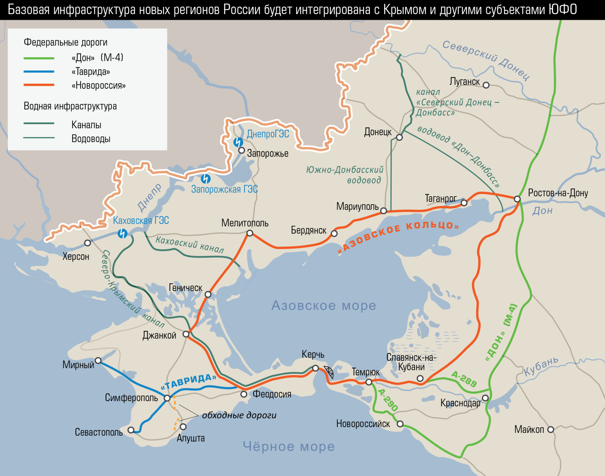 Включение в 2022 году в состав России новых регионов требует развития в них современной автодорожной инфраструктуры и ее интеграции в общефедеральную сеть. Опорной магистралью новых регионов должна стать федеральная трасса Р-280 «Новороссия» протяженностью 653 км, которая образует кольцо вокруг Азовского моря: Ростов-на-Дону — Таганрог — Мариуполь — Бердянск — Мелитополь — Джанкой — Керчь — Темрюк — Ростов-на-Дону (см. карту 2). Ремонт и реконструкция действующих участков трассы уже ведутся.