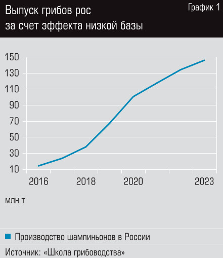 Все изменилось после введения продовольственного эмбарго в 2014 году. Шампиньоны подорожали втрое, соответственно снизилось и потребление — до 40 тыс. тонн в год. Но бизнес в этом увидел перспективу. В отрасль хлынули инвестиции, подогреваемые мерами господдержки в виде льготного кредитования — краткосрочного, до года, и инвестиционного, на срок от двух до восьми лет при пониженном НДС в 10%. Уже в 2017 году производство шампиньонов выросло более чем в четыре с половиной раза по сравнению с 2014-м и достигло почти 24 тыс. тонн, еще примерно 22 тыс. импортировалось. В 2019 году в стране выращивалось 67 тыс. тонн грибов.