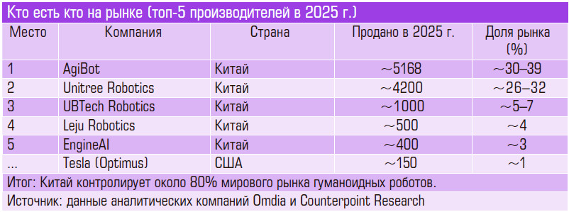 Открытием последних месяцев на рынке робототехники стали китайские разработки. Вчера еще никому не известные стартапы Unitree Robotics и AgiBot уже подвинули Tesla: каждая из компаний успела выпустить около 5000 человекообразных роботов, вместе они контролируют почти 60% глобального рынка. Такой рывок объясняется в первую очередь государственной поддержкой («воплощенный интеллект» признан одним из приоритетных направлений в рекомендациях к 15-му пятилетнему государственному плану развития КНР), а также мощной производственной базой Поднебесной и позитивным информационным шумом. Роботы в Китае уже дают концерты, поступают, пока еще в экспериментальном режиме, в академии и учатся на правах обычных студентов; в Пекине также проводятся всемирные игры человекоподобных роботов.