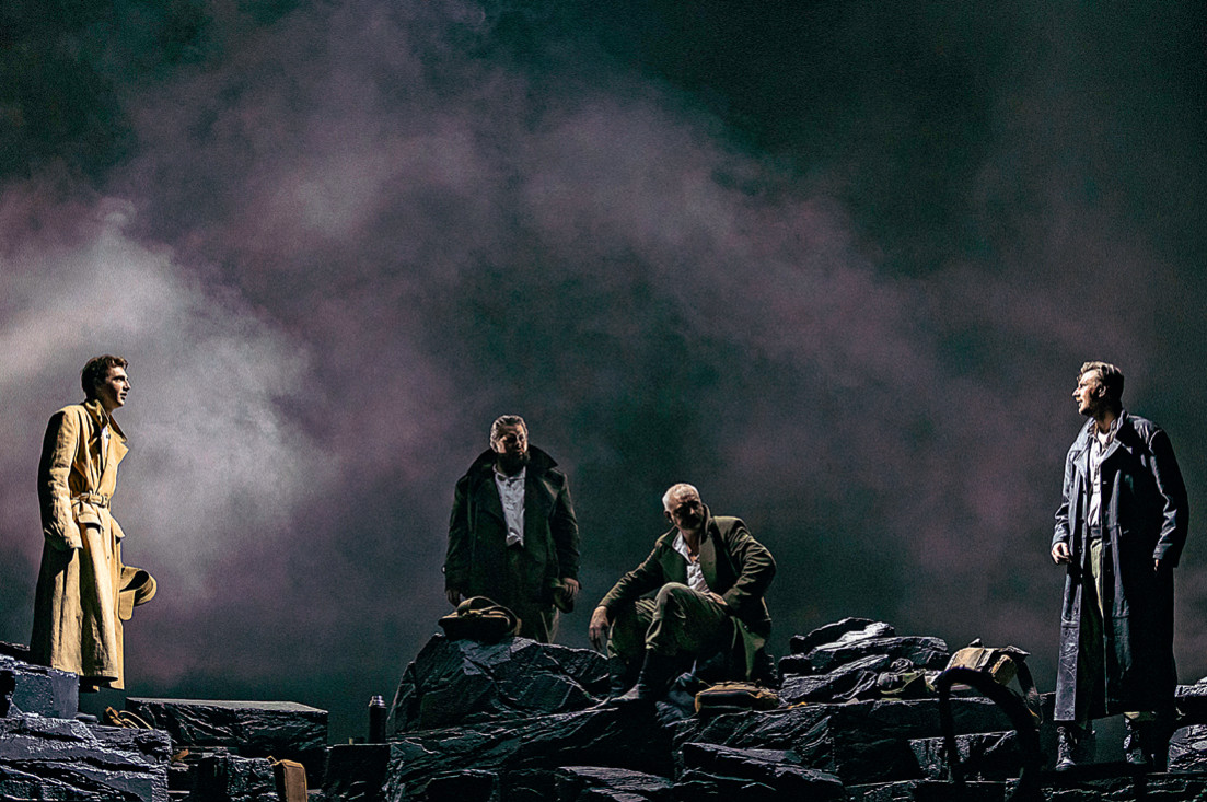 В РАМТе действие начинает веселая афера «Игры интересов». Но на заднике при этом — изображающее ужасы войны полотно Томаса Коула «Крушение» 1836 года из серии «Путь империи», в которой речь идет о взлете и падении воображаемого города. Потом огромная картина исчезает, и в ее золоченой раме обнаруживается ниша, где разыгрывается драма военных будней. Здесь все в монохроме: над камнями клубится дым, люди ходят в пыльных шинелях. Кстати, гримеры спектакля для правдоподобности даже зачерняли актерам