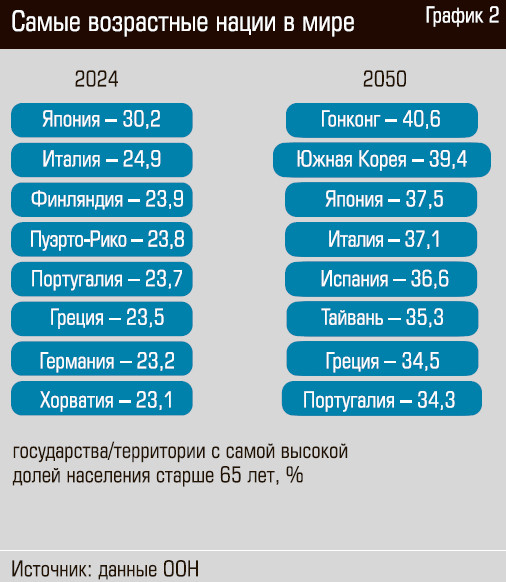 Уже к середине века Япония, Корея, Тайвань (и далее по списку) станут обществами пенсионеров: число граждан в возрасте старше 65 лет превысит 35%, а кое-где достигнет 40%, тогда как в самой возрастной стране Европы — Италии — этот показатель сегодня составляет менее четверти всего населения.