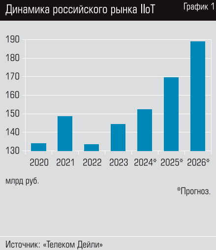 Российский рынок промышленного интернета вещей в 2023 году прибавил 8% относительно предыдущего года, в денежном выражении его объем составил 144 млрд рублей — такие данные приводятся в исследовании информационно-аналитического агентства «Телеком Дейли». По прогнозам специалистов, к 2026 году рынок достигнет отметки 189 млрд рублей.