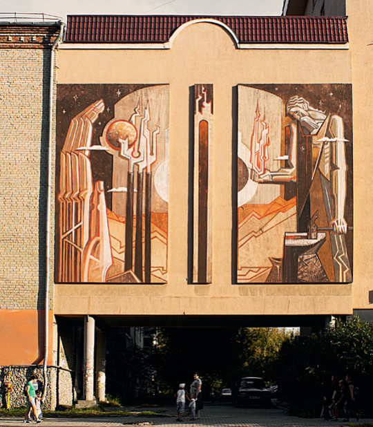В Екатеринбурге я сначала работал на «Уралмаше». Это был Гефест, бог-кузнец. Сюжет диктовал сам индустриальный пейзаж и дух этого брутального района города — там были интересные сочетания плит и ритмика труб. Сюжет часто образуется интуитивно: видишь место, возникает ассоциативный ряд. В этой работе я сочетал греческую, античную мифологию с какими-то элементами индустриального мира и стилистикой конструктивизма.