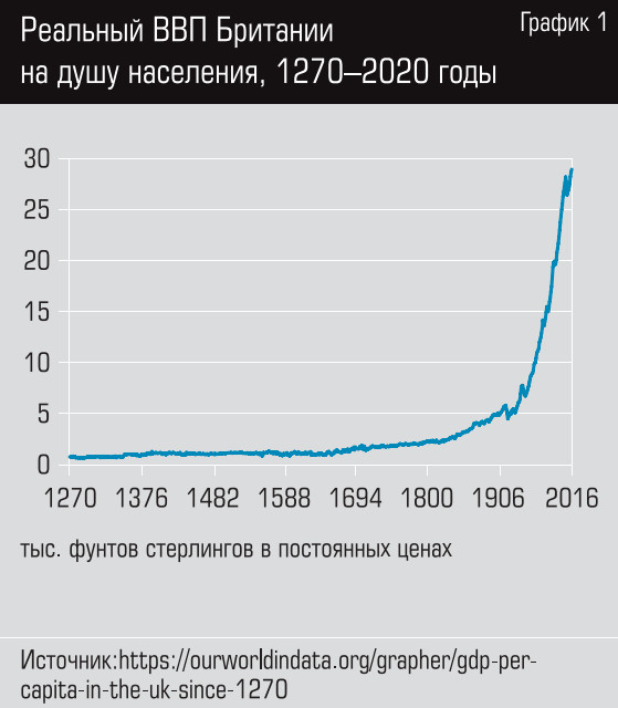 Исторические данные свидетельствуют, что на протяжении тысячелетий среднемировой доход на душу населения оставался практически неизменным. По оценкам видного макроэкономического историка Ангуса Мэддисона, в 1000 году этот показатель был таким же, как и в начале нашей эры, а в 1823-м оказался лишь на 53% выше, чем в 1000-м. Однако примерно 200 лет тому назад экономика Британии, а вслед за ней и экономики ряда других стран вышли на траекторию стабильного долговременного роста, который в итоге дал грандиозное повышение уровня среднедушевого дохода. Эта впечатляющая картина представлена на графике 1, показывающем динамику душевого дохода для Британии с 1270 года до настоящего времени.