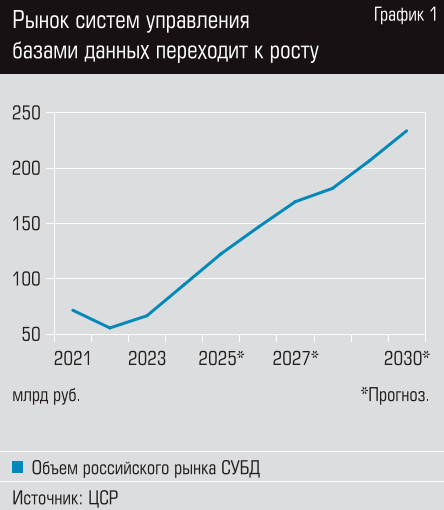 Сам российский рынок решений СУБД все это время активно восстанавливается после падения в 2022 году и сейчас переходит к устойчивому росту. По данным ЦСР, если в 2022 году он сократился по сравнению с 2021-м на 22%, до 56 млрд рублей, то в 2023-м почти отыграл падение, достигнув 67 млрд, а по итогам текущего года вырастет на 41% — до 95 млрд. Более того: в ближайшие шесть лет, по прогнозам, рынок увеличится еще в два с половиной раза — до 234 млрд рублей (см. график 1).