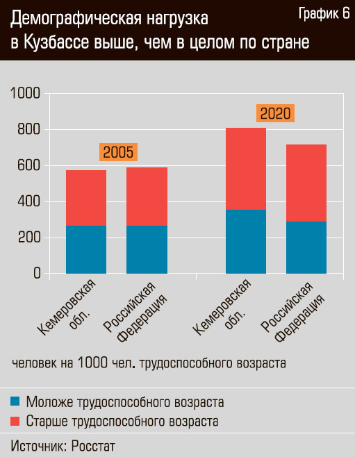 Очень тревожны демографические тенденции. Естественная убыль населения Кемеровской области в расчете на тысячу жителей с начала 1990-х годов систематически превышает значения этого показателя для СФО и страны в целом (см. график 5), а начиная с 2010 года жители Кузбасса голосуют против своего региона ногами (фиксируется систематический миграционный отток), как, впрочем, и кошельками — заметную часть заработков кемеровчане предпочитают тратить за пределами области, прежде всего в преуспевающей столице Сибири — соседнем миллионнике Новосибирске. Со времени последней советской переписи 1989 года население Кузбасса сократилось на 20%, или на 650 тыс. человек (для сравнения: крупнейшие города области, Кемерово и Новокузнецк, насчитывают сегодня порядка 550 тыс. жителей каждый). Возрастная структура населения неблагоприятна. Если в середине 2000-х демографическая нагрузка в регионе примерно соответствовала среднероссийскому уровню, то в 2020 году она составила 808 иждивенцев на тысячу трудоспособных против 713 в целом по стране (см. график 6).
