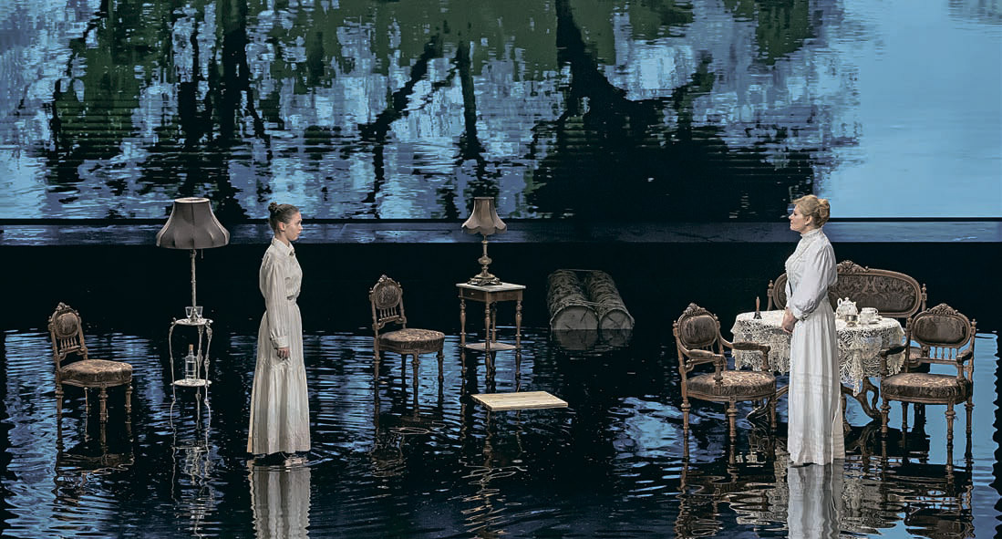 Владимир Арефьев, сценограф спектакля «Лес», заполнил сцену водой. Уже этого достаточно, чтобы причислить трактовку классической пьесы Егором Перегудовым к одной из самых необычных за всю ее историю. Вода на сцене, несмотря на все технические сложности обращения с ней, часто используется в спектаклях. Она эффектна. Создает насыщенный эмоциональный фон. Но чтобы все театральное действие происходило на заполненной до краев водой сцене — едва ли на такое решался кто-то еще. Егору Перегудову на протяжении почти всего спектакля приходится оправдывать присутствие воды, постоянно взаимодействуя с ней, чтобы зритель воспринимал ее как нечто само собой разумеющееся. В результате мы наблюдаем сложную постановочную эквилибристику, с помощью которой рассказывается история не только о лесе, принадлежащем помещице Гурмыжской, и о том, какую роль он играет в жизни людей, но и о воде, тоже ставшей действующим лицом.