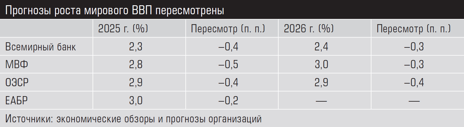 Международный валютный фонд (МВФ) в апрельском выпуске бюллетеня «Перспективы развития мировой экономики» тоже понизил прогноз роста мирового ВВП на 2025 год — на 0,5 п. п., до 2,8%. Был понижен и прогноз Организации экономического сотрудничества и развития (ОЭСР), причем два раза: сначала в марте, а затем в июне. В итоге текущий прогноз ОЭСР уменьшился по сравнению с декабрьским на 0,4 п. п. и сейчас составляет 2,9%.