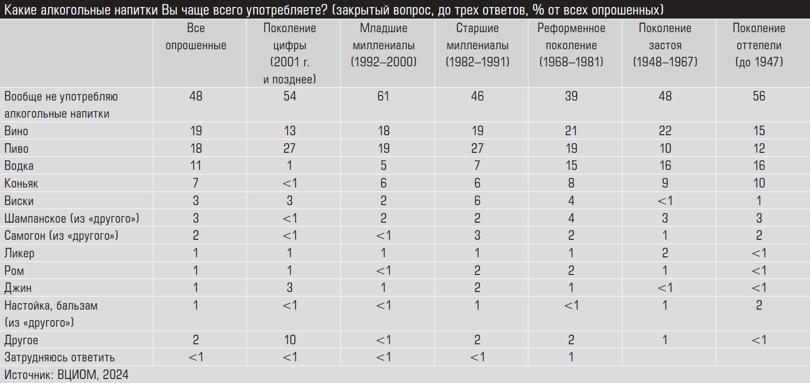 ВЦИОМ в 2024 году свидетельствует: доля абстинентов (тех, кто вообще не пьет спиртного) почти сравнялась с потребителями алкоголя — 48 и 52% соответственно, тогда как 20 лет назад трезвенников было всего 27%. То есть сегодня каждый второй житель страны не употребляет спиртные напитки вообще.
