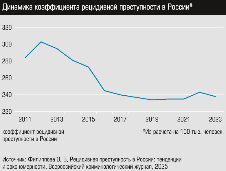 В то же время, согласно данным судебного департамента, к реальному лишению свободы за 2024 год были приговорены 89 552 рецидивиста. В 2023-м их было 106 419. Этот позитивный результат может быть связан с действием Закона о пробации.