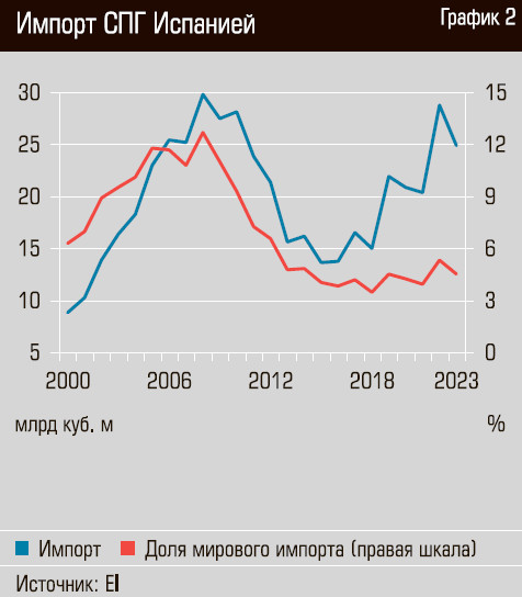Вторым китом является газовая генерация. Своего газа на полуострове нет, он импортируется. Газ поставлялся как по двум подводным газопроводам из Алжира (Medgaz, 8 млрд кубометров в год, и MEG, 12 млрд кубометров в год). Газовые ТЭС размещались преимущественно на юге страны, ближе к окончаниям транссредиземноморских труб. Постепенно Испания стала также одним из крупнейших в мире импортеров СПГ — до 25 млрд кубометров, или 4,5% мирового импорта в 2023 году. В 2000-е на Испанию в отдельные годы приходилось и до 11% мирового импорта СПГ (см. график 2).