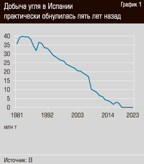 Первый — это угольная генерация. Россыпь относительно крупных (по европейским меркам) угольных электростанций разместилась преимущественно на северо-западе страны, в Галисии и Астурии, где изначально опиралась на местные запасы углей (см. карту). Еще в 1980-е годы Испания представляла собой довольно крупного производителя угля, годовые объемы добычи доходили до 40 млн тонн (см. график 1). В 1990-е годы местная угледобыча стала сдавать позиции, а после кризиса 2009 года пустилась в галопирующий обвал. К 2019 году промышленно значимая добыча здесь прекратилась вовсе, хотя доказанные запасы угля в стране на тот момент оценивались в 1,2 млрд тонн. Остатки угольной генерации (1,2% энергобаланса) работают на привозном угле.