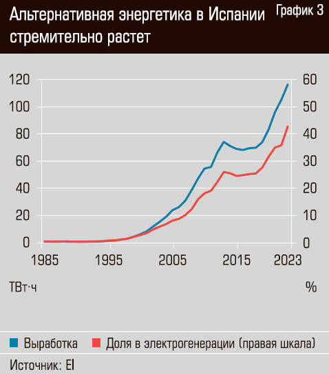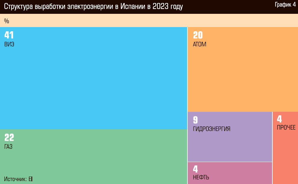 В нынешнем веке абсолютным приоритетом левых испанских властей стала зеленая повестка в энергетике. Выработка электроэнергии альтернативными источниками в Испании в 2000-е годы выросла почти на порядок, с 6,2 ТВт⋅ч в 2000 году до 54,6 ТВт⋅ч в 2010-м, а к 2023 году еще удвоилась (116,5 ТВт⋅ч, см. график 3). По оценке британского Energy Institute (EI) в 2023 году в Испании при общем объеме выработки электроэнергии в 282 ТВт⋅ч на солнце и ветер пришлось в сумме 41%, что почти соответствовало суммарной доле выработки на газовых (22%) и атомных (20%) электростанциях (см. график 4).