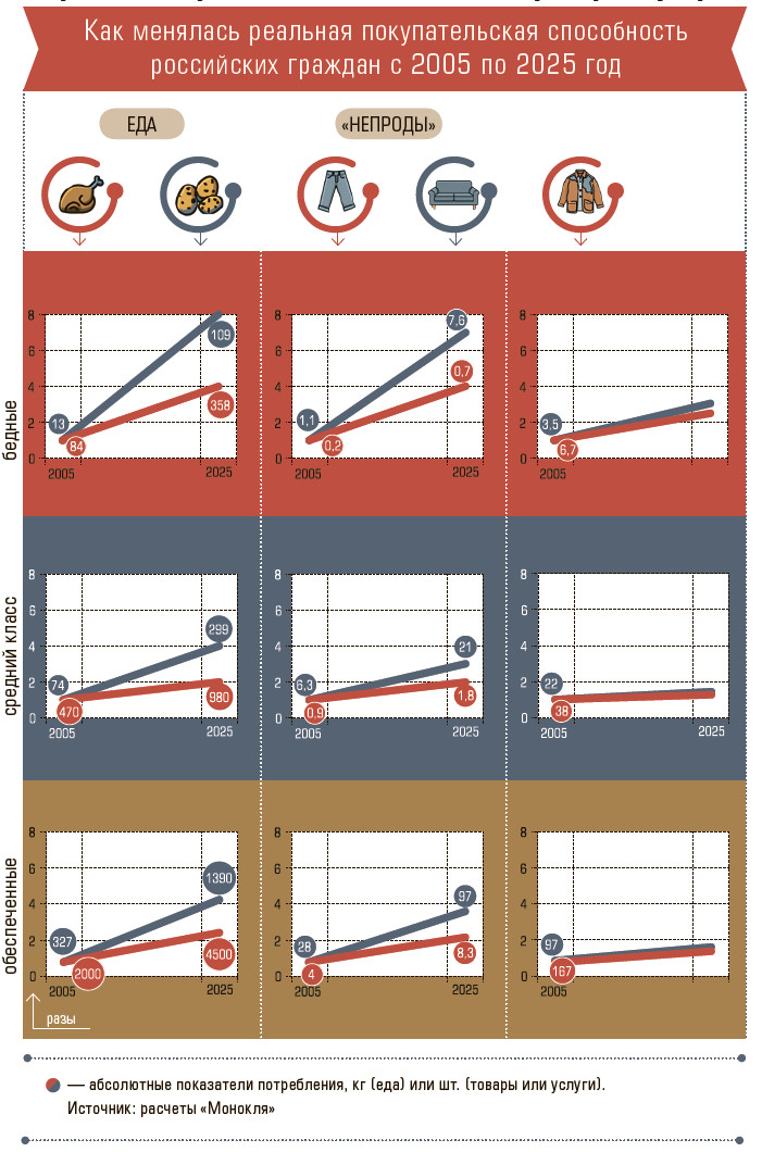 Представитель среднего класса мог купить 0,8 телевизора двадцать лет назад — и 21 телевизор теперь, или 0,9 и 1,8 дивана-кровати, или два и четыре телефона в 2005 и 2025 годах соответственно. У богатых картина такая: 3,6 и 9,7 телевизора, 4 и 8,3 дивана-кровати, 8 и 19 сотовых телефонов / смартфонов. Напомним, что расчеты делались нами по средним ценам Росстата, а не по минимальным ценам на простые модели.