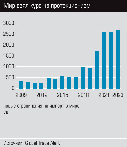 «Неолиберализм закончился», — констатирует Bloomberg. По данным Организации экономического сотрудничества и развития, в прошлом году торговля товарами в странах «большой двадцатки» в стоимостном выражении сократилась. Обратная сторона этого процесса — резкий рост разного рода протекционистских мер, и не только в странах G20, но и по всему миру (см. график). Экономисты Давосского форума переживают, что все больше стран развивают собственную промышленную политику и собственное производство.