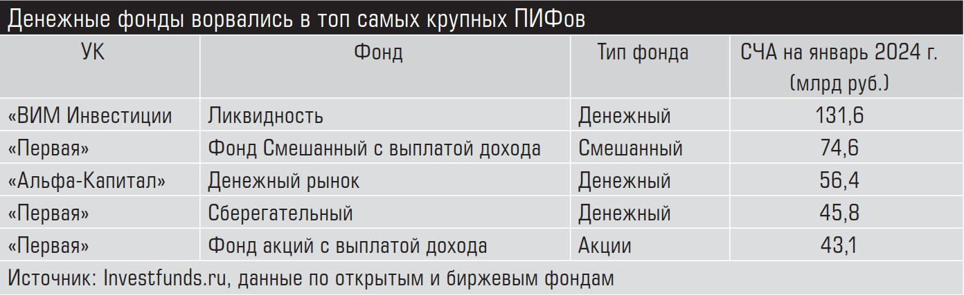 За минувший год отечественные инвесторы принесли в рыночные ПИФы более 205 млрд рублей. Распределение по типам ПИФов при этом оказалось крайне неравномерным. Если из фондов акций и облигаций наблюдался некоторый отток, 4,01 млрд и 18,7 млрд рублей соответственно, то приток в ПИФы денежного рынка (напомним, они используют для заработка краткосрочные инструменты на межбанковском рынке) компенсировал все с лихвой: в эти фонды пришло более 212 миллиардов. Это, по сути, продолжение тренда 2022 года. Если в 2021 году российские инвесторы принесли в смешанные фонды и фонды акций 333,8 млрд рублей, то в 2022-м приток сменился оттоком (−32,05 млрд рублей), и только денежные ПИФы на общем фоне показали себя лидерами рынка (+9,41 млрд рублей). В 2023 году фонды денежного рынка благодаря мощному притоку свежих денег вошли в топ самых крупных ПИФов (см. таблицу).