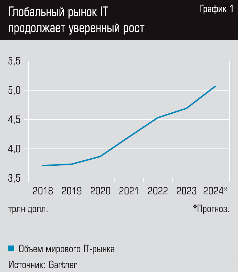 Данные о массовом увольнении контрастируют с общими показателями развития мирового IT-рынка и продолжающейся цифровизацией многих сфер жизни человечества. По оценкам аналитиков Gartner, мировой объем закупок IT-товаров и услуг продолжает уверенно расти: предположительно по итогам текущего года он достигнет 5,1 трлн долларов, это на 8% больше, чем в 2023 году. А всего за последние пять лет он вырос на 35% — почти на 1,5 трлн долларов (см. график 1). При этом сегмент разработки программного обеспечения и IT-услуг опережает среднерыночные показатели, в 2024 году ожидается его рост на 13,8%. Получается, что спрос на IT-рынке растет, а людей требуется все меньше.