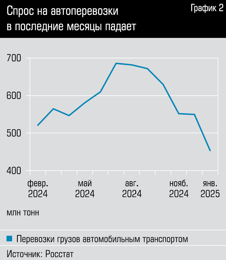 Однако в начале этого года динамика роста ударила по тормозам. В частности, в январе, по данным Росстата, объем грузоперевозок уменьшился до 454 млн тонн, это на 33% меньше, чем в рекордном для прошлого года июле (686 млн тонн; см. график 2).