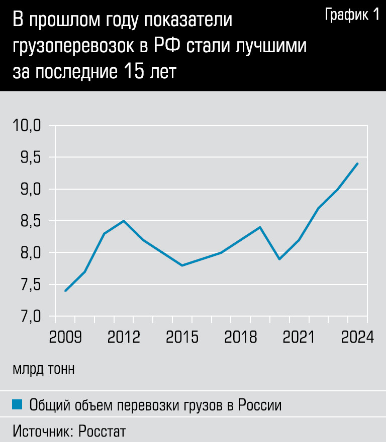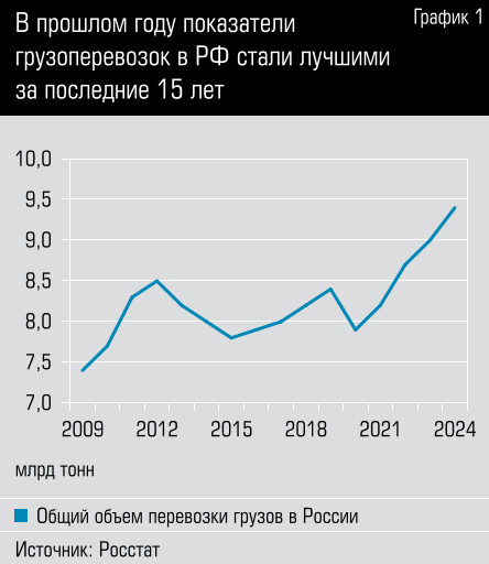 Главной причиной снижения тарифов участники логистического рынка называют падение спроса на перевозку грузов в разных отраслях, что является тревожным сигналом для всей экономики. Еще недавно востребованность транспортных услуг в стране активно росла. По данным Росстата, общий объем грузоперевозок в 2024 году достиг рекорда за последние 15 лет — 9,4 млрд тонн, на 5,5% больше, чем в 2023-м, и, например, на 27% больше, чем в 2009 году (см. график 1).