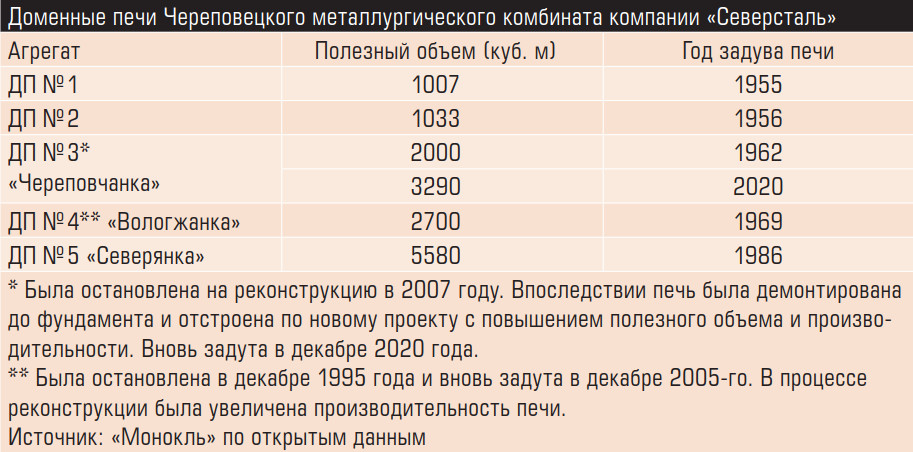 Первого апреля «Северсталь» остановила на капитальный ремонт доменную печь № 5 (ДП-5) «Северянка» на Череповецком металлургическом комбинате. Это самая крупная из пяти домен ЧерМК. Текущая производительность «пятерки» — 4,2 млн тонн, что составляет более трети всей годовой выплавки чугуна комбината.