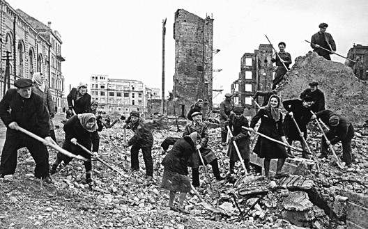 Еще во время войны началось восстановление пострадавших городов, в том числе по инициативе самих жителей. Так, в июне 1943 года сталинградские девушки во главе с работницей детского сада Александрой Максимовной Черкасовой после смены вышли на восстановление Дома Павлова. Этим было положено начало так называемому черкасовскому движению. За первые два года активисты в Сталинграде восстановили 25 школ, 13 детских садов, 10 яслей, пять больниц, восемь зданий культурно-бытового назначения, часть водопроводной линии. Заново построили 100 домов.