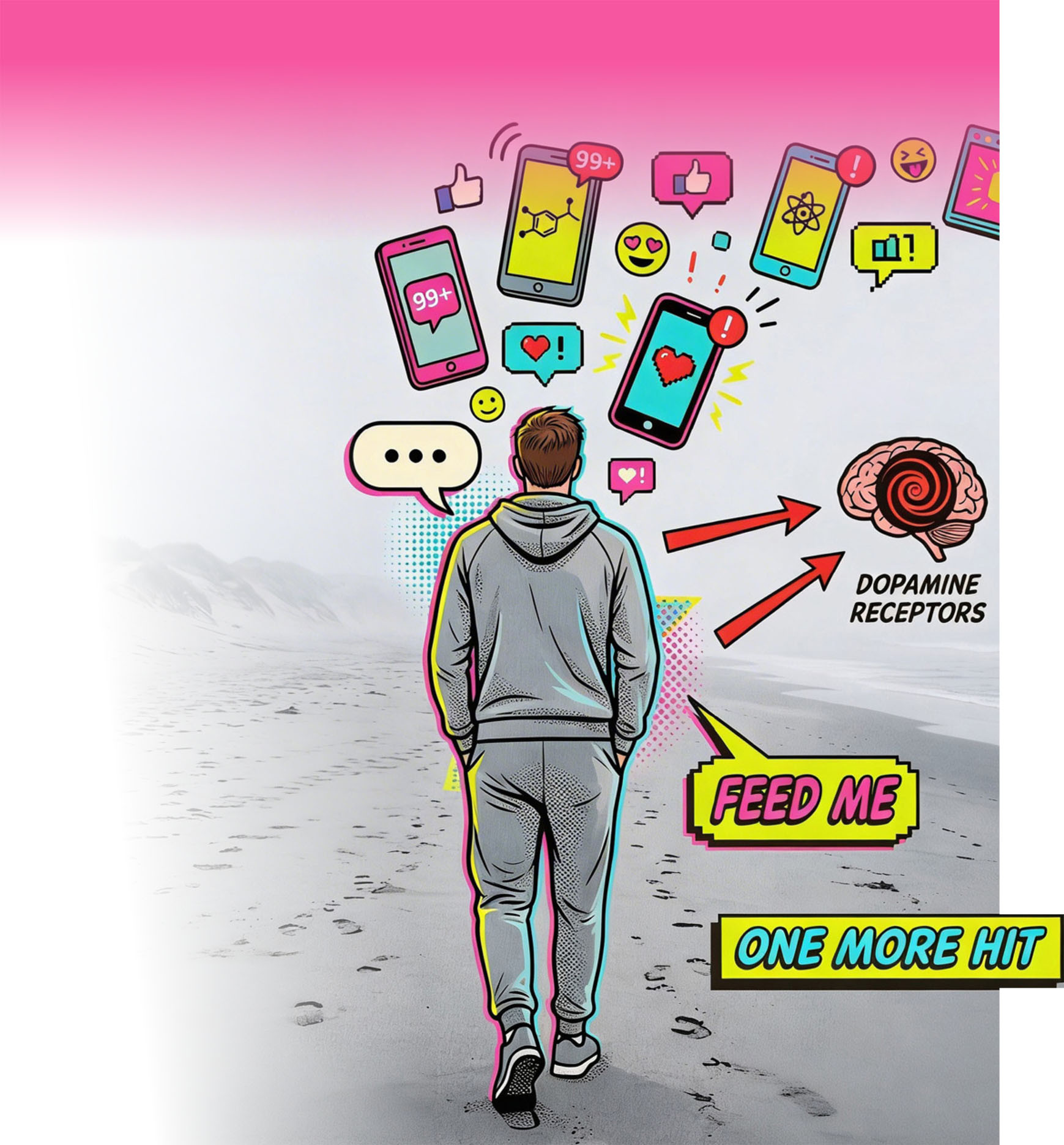 Дофамин задуман природой как механизм выживания в условиях дефицита ресурсов. Это «молекула мотивации», которая заставляла наших предков искать еду, партнеров, секс, новые территории, новую информацию. Проблема в том, что сегодня мы живем в мире «дешевого» дофамина: соцсети, игры и фастфуд эксплуатируют эту древнюю систему, заставляя нас бесконечно нажимать на «кнопку удовольствия» без реальной пользы для жизни. Постоянная стимуляция приводит к тому, что рецепторы теряют чувствительность и нам требуется все больше «допинга», чтобы просто чувствовать себя нормально.