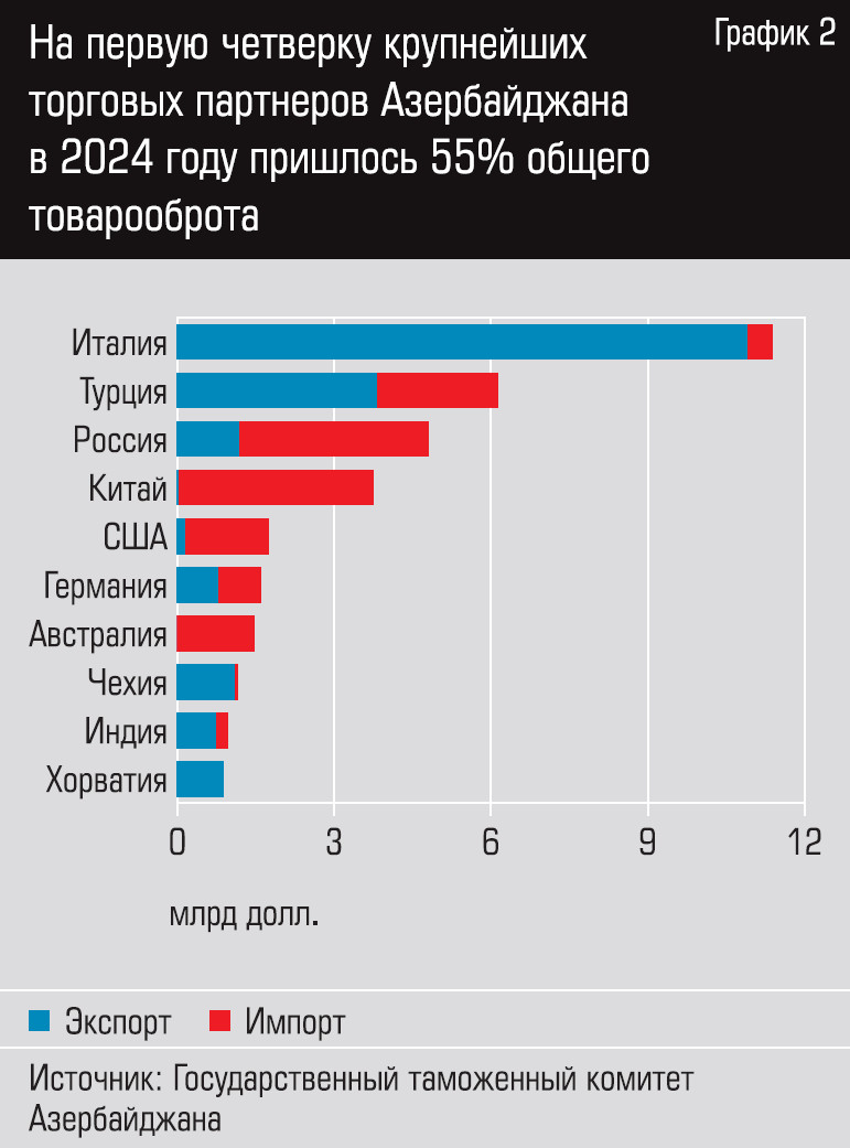 Ведущая четверка торговых визави нашего южного соседа более или менее стабильна — это Италия, Турция, Россия и Китай. На них в последние годы приходится в общей сложности 55–60% внешнеторгового оборота Азербайджана (см. график 2). За пределами четверки нередки ситуативные скачки и провалы. Так, по итогам прошлого года Израиль с шестого места вылетел из первой десятки, США поднялись с девятого места на пятое, а их место заняла Индия, хотя еще год назад была седьмой. Зато в первую десятку, сразу на седьмую позицию, десантировалась Австралия.