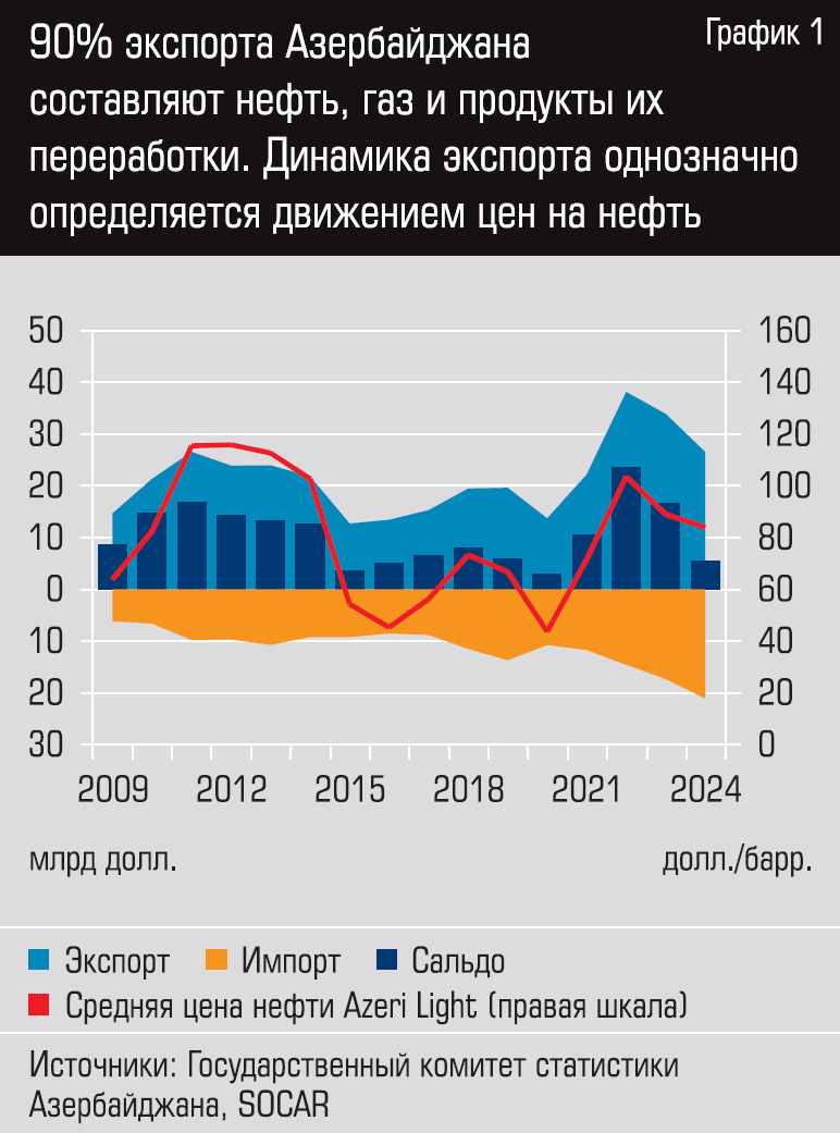 Торгует с внешним миром в последние полтора десятилетия Азербайджан исключительно в плюс — импортные аппетиты, как правило, строго следуют за объемами экспортной выручки, а последняя четко следует за нефтяной конъюнктурой (см. график 1). И это неудивительно: если в России экспорт нефти и газа формирует половину экспорта, то в Азербайджане — 87%, еще чуть менее 3% приходится на продукты нефтепереработки и нефтегазохимии. Тройку ведущих позиций в импортной корзине примерно поровну делят продовольствие, оборудование и автомобили.