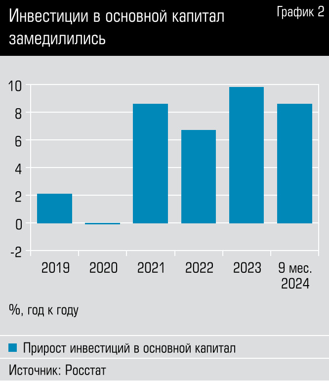 Продолжается, пусть и не такими быстрыми темпами, как раньше, рост реальных зарплат. По данным Росстата, реальная среднемесячная начисленная заработная плата в январе–сентябре 2024 года выросла по сравнению с аналогичным периодом предыдущего года на 9%, а в сентябре — на 8,4% (к сентябрю 2023-го).