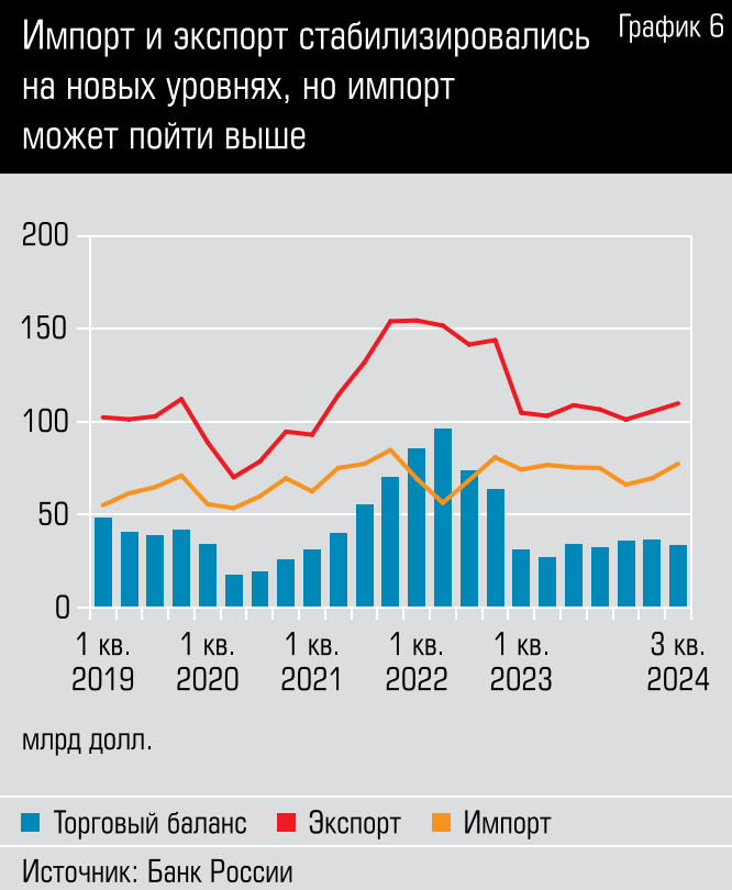 В итоге, по данным Федеральной таможенной службы, за январь–октябрь 2024 года импорт в Россию сократился на 2,7%, в то время как экспорт вырос на 0,9%. Конечно, ни о каком дефиците платежного баланса речи и близко не идет — по результатам января–ноября профицит торгового баланса РФ составил 118,6 млрд долларов, на 7,1% больше, чем за аналогичный период 2023 года. Этот профицит, скорее, неплохо бы было сократить, так как идеальная ситуация для торгового баланса страны — это выход в ноль. Профицит означает, что мы кредитуем наших торговых партнеров, и хорошо, если мы за это получаем какие-то нефинансовые выгоды или трансформируем этот профицит в зарубежные инвестиции, что в нашем случае вряд ли происходит.