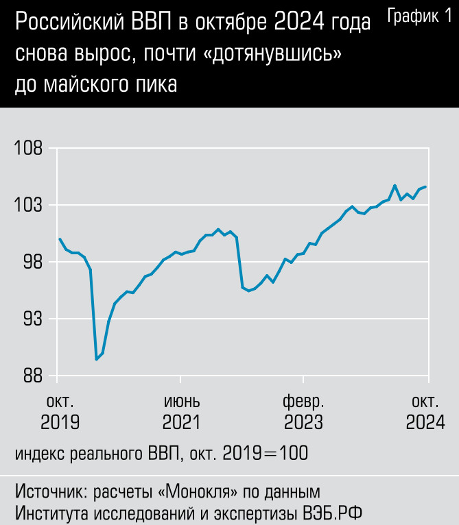 Прогнозы экономического и финансового сообщества на 2022, 2023 и 2024 годы последовательно не сбывались. От 2022-го ожидали обвала, но по его итогам ВВП сократился на скромные 2,1%. От 2023-го и 2024-го последовательно ожидали вялого роста, и только «Эксперт» в начале 2023 года и «Монокль» в конце 2023-го говорили о росте выше 4% — что по факту и случилось. Напомним, ровно год назад, в декабре, консенсус аналитиков по 2024 году был таков: рост в пределах 1–1,5%, так как 2023-й считался некой аномалией и восстановлением после 2022 года (см. «Поправили базу», «Монокль» № 1–3 за 2024 год). Мы указывали, что «на земле» все свидетельствует о мощном рывке: компании в обрабатывающей промышленности видели серьезный, подчас кратный рост спроса и спешили застолбить за собой открывшиеся ниши рынка, инвестируя изо всех сил. Сейчас мы видим, что ВВП по итогам десяти месяцев вырос на 4,1% к соответствующему периоду 2023 года, и, скорее всего, по году рост будет в районе 4%, возможно, немного недотянет до этой цифры (см. график 1).