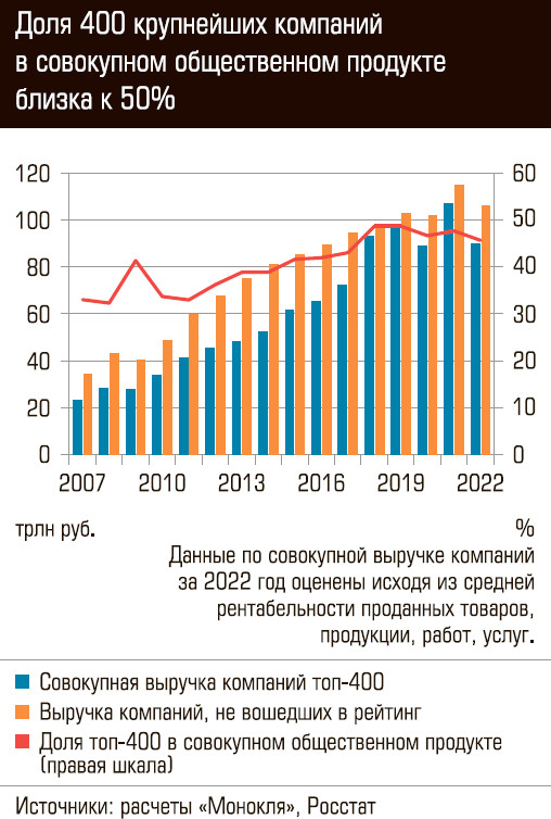 В этом году, несмотря на продолжающиеся сложности с раскрытием информации, мы вновь выпускаем наш традиционный рейтинг крупнейшего бизнеса России. Многие компании из-за боязни подпасть под санкции продолжают уходить в тень. Кстати, этому тренду уже много лет. Все началось еще в 2014 году, когда свою отчетность перестали публиковать крупные компании ВПК. Впрочем, это не защитило их от санкций. Все они наперечет и давно известны, впрочем, как и другой крупный бизнес России. Попытки укрыться под покровом тишины — малоэффективная стратегия от нечестной конкурентной борьбы со стороны США и европейских стран. Как только бизнес становится масштабным и начинает мешать «западным партнерам», его тут же начинают прессовать. Избежать санкционного давления удается единицам, часто за счет эксклюзивного мирового положения. Например, в легком санкционном режиме живут производители удобрений, практически не касаются санкции госкорпорации «Росатом».