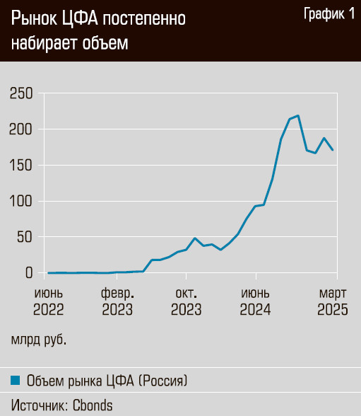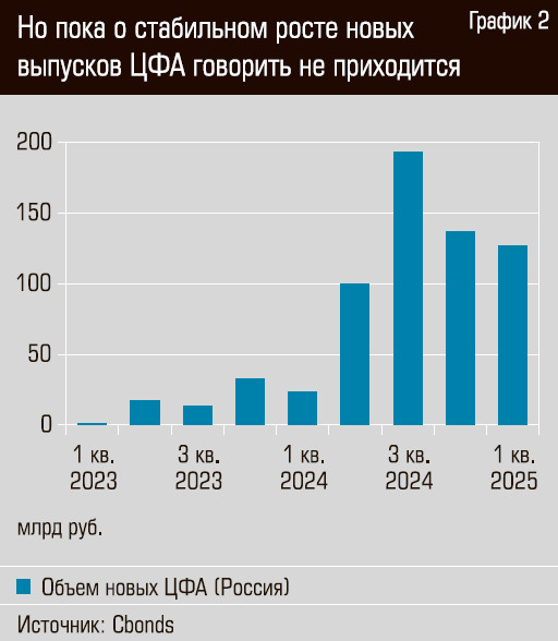 По данным Cbonds, в марте объем сегмента ЦФА снизился с 187,9 до 171,1 млрд рублей за счет погашения крупных выпусков банков ВТБ и ВБРР. Новые выпуски в целом за первый квартал текущего года составили 127,1 млрд, это на 7,3% ниже показателя предыдущего квартала и на 34,3% меньше пикового значения третьего квартала 2024 года (193,5 млрд). Собственно, тогда же, в ноябре 2024-го, был достигнут максимум в 219,2 млрд. Потом часть выпусков была благополучно погашена.