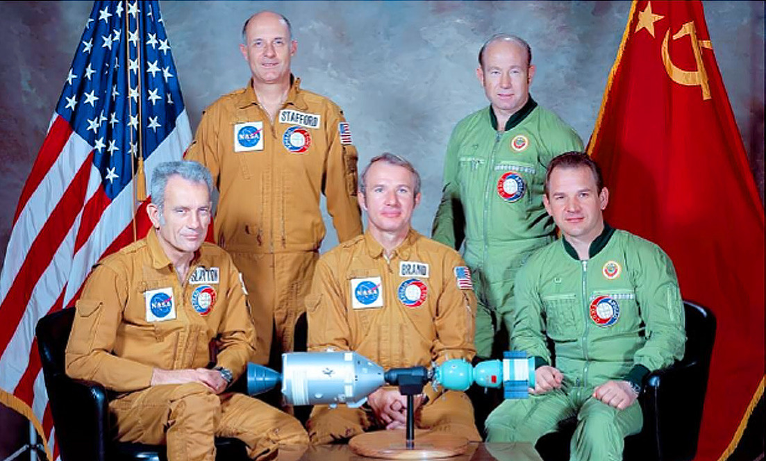 Экипажи космических кораблей. Второй ряд: Алексей Леонов — командир корабля «Союз-19», летчик-космонавт СССР, Валерий Кубасов (справа) — бортинженер, летчик-космонавт СССР. Слева американские астронавты: Томас Стаффорд (стоит) — командир корабля «Аполлон», Дональд Слейтон (слева сидит), Вэнс Бранд, 1 апреля 1975 года. Автором всемирно известной нашивки, как и логотипа совместной программы в целом, являлась сотрудница КБ Королёва Галина Балашова. Она же автор множества других эмблем, вымпелов и другой космической символики СССР вплоть до начала 1990-х. Долгие десятилетия она была единственным профессиональным архитектором (а не инженером) в КБ и принимала участие в разработке компоновки «Союзов», «Салютов», «Мира». Занимателен тот факт, что на созданных ею и утвержденных эскизах интерьеров бытового отсека «Союза» между поручнями были нарисованы пейзажи. Когда в цехе делали эти отсеки, то звонили конструкторам: где взять картинки? Галина Балашова рисовала дома пейзажи и относила их в цех для очередного бытового отсека. Пейзажи эти сгорали вместе с бытовыми отсеками при спуске «Союзов» с орбиты, так как на Землю возвращался только спускаемый аппарат