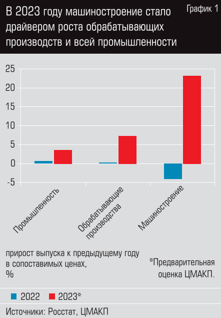 «Рост в машиностроении не только интенсивный, но и практически фронтальный — он захватывает все сектора, просто где-то кризисный провал 2022 года уже с лихвой перекрыт, а где-то, например в автомобильной промышленности, рост менее сильный и пока восстановительный, — констатирует