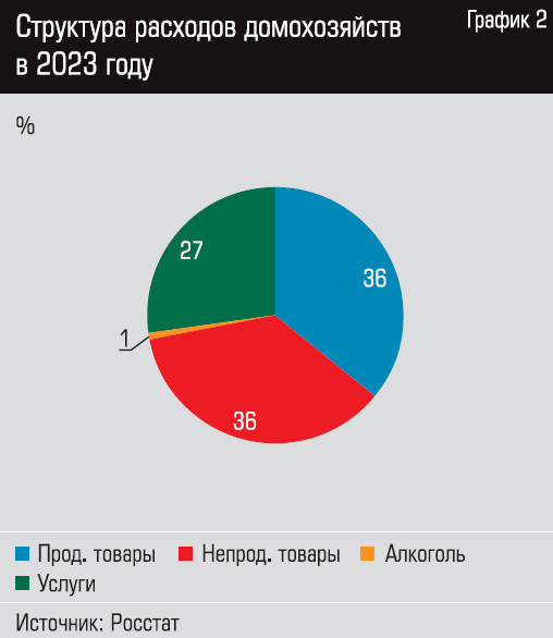 В целом в укрупненной структуре расходов домохозяйств с 2005 по 2023 год произошли заметные изменения. Доля продовольственных товаров снизилась с 39 до 36%, доля алкоголя — с 2 до 1%. Сократились расходы и на непродовольственные товары — с 37 до 36%, а вот доля услуг заметно увеличилась: на 5 п. п., с 22 до 27% (см. графики 1 и 2).