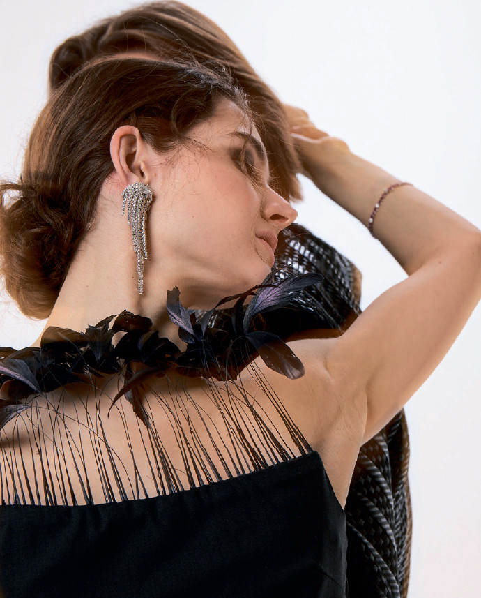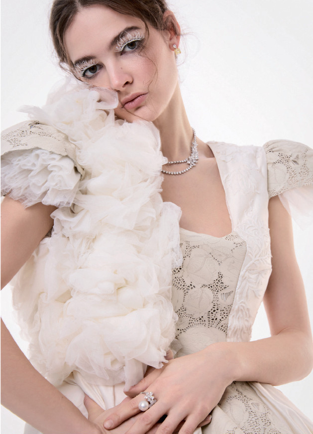 Платье, Polina Mircheva Couture; серьги из белого золота с белыми и желтыми бриллиантами из коллекции Classic; колье из белого золота с бриллиантами и кольцо из белого золота с бриллиантами жемчугом и лунными камнями из коллекции Flower, все – Mercury
