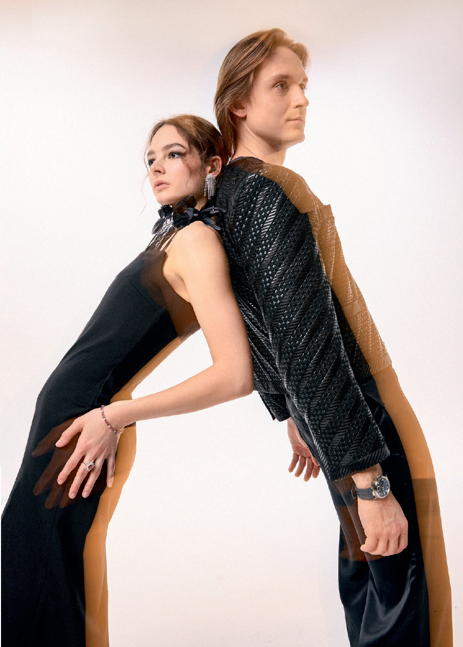 Здесь и далее на Элеоноре: платье, Guiseppe di Morabito (elyts.ru); серьги из белого золота с бриллиантами, Yeprem; кольцо из белого золота с бриллиантами и рубином, браслет из белого золота с бриллиантами и рубинами, коллекция Color, Mercury. На Денисе: куртка, Viva Vox; футболка, Corneliani (elyts.ru); брюки, Dries Van Notten; часы Marine из белого золота на каучуковом ремешке, Breguet
