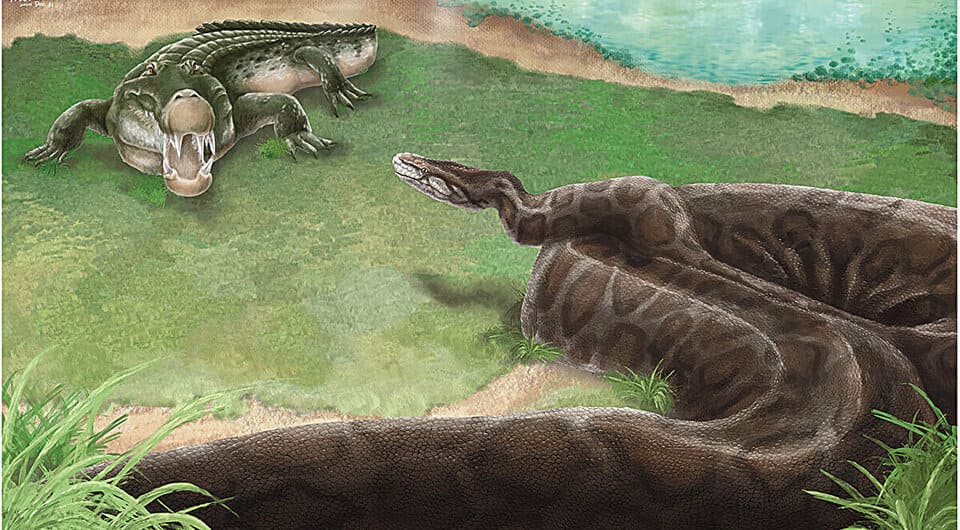 Художественная реконструкция питона Python sp., позвонок которого обнаружен на Тайване (справа). Слева изображен вымерший гавиал Toyotamaphimeia taiwanicus. Cheng-Han Sun / Lab of Evolution and Diversity of Fossil Vertebrates, National Taiwan University