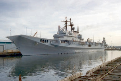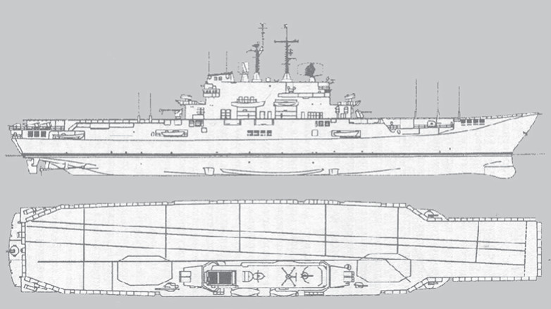 Архитектура этого корабля типовая для авианосцев со сплошной палубой и расположенной по правому борту надстройкой островного типа. Конструкции корпуса рассчитаны на ЭВМ с оптимизацией по прочностным и мореходным характеристикам. Он собран из более чем 400 блоков, при их изготовлении использованы в основном высокопрочные стали. По длине корпус разделен на 15 водонепроницаемых отсеков, по высоте имеет 6 палуб, причем ангарная, расположенная под полетной палубой, выполнена водонепроницаемой. На большей части длины корпуса имеется второе дно, в котором оборудованы цистерны для топлива, масла и пресной воды. Полетная палуба 173,8 м длиной, 21 м шириной и общей площадью 450 м² оснащена рамповым трамплином высотой 1,7 м на длине 33 м под углом 7,5°. Ангар имеет длину 10 м, ширину 15 м, высоту 6 м и рассчитан на размещение 12 вертолетов противолодочной обороны «Агуста-Сикорский» или 10 СВВП, хотя, если возникает потребность, позволяет разместить даже тяжелый вертолет типа СН-47 «Чинук». Есть два палубных самолетоподъемника: один спереди «острова» и один за ним, имеется шесть размеченных посадочных площадок для действий вертолетов.