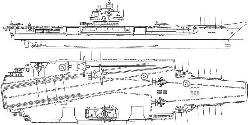 В 1984 году главный противник авианосцев умер. Практически сразу после этого Невскому ПКБ поручили проектирование настоящего атомного авианосца с увеличенным водоизмещением, большим количеством самолетов и паровыми катапультами. Несмотря на существенное отличие от кораблей типа «Киев», авианосец все же продолжают называть седьмым ТАВКР – проект 1143.7. При закладке этого корабля на стапеле Черноморского судостроительного завода (ЧСЗ) в Николаеве 25 ноября 1988 года он получил наименование «Ульяновск». ТТЗ на его разработку в соответствии с программой вооружений на 1986–1995 годы НПКБ получило в декабре 1984 года. В 1986 году был завершен и утвержден эскизный, а в 1987-м – технический проект (главный конструктор – Л.В. Белов, затем Ю.М. Варфоломеев). В октябре того же года утвердили основные элементы атомного тяжелого авианесущего крейсера (АТАКР): авиагруппа в составе 70 летательных аппаратов (истребители Су-27К и МиГ-29К, самолет РЛД и наведения Як-44РЛД, вертолеты Ка-27 и Ка-31), трамплин, две катапульты, аэрофинишеры, новый ПКРК «Болид» (позже заменен на «Гранит»), ЗРК «Кинжал», ЗКБР «Кортик», четырехвальная АЭУ (280 тыс. кВт), полное водоизмещение 73 400 т, скорость полного хода – 30 узлов.