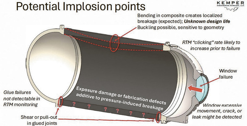 При рабочей глубине погружения 8600 м и коэффициенте запаса прочности 1,5 толщина стенок цилиндрического прочного корпуса, выполненного из углепластикового композита, должна была составлять не менее 81,3 мм. В отчете, в частности, отмечалось, что одним из наиболее критически важных компонентов конструкции является клеевое соединение между композитным корпусом и титановыми сегментами. Подготовка поверхности имела решающее значение, а о прочности соединения титана и углеродного волокна было известно мало. Хотя прочность соединения на сдвиг может быть менее критичной из-за сжимающей нагрузки на линии склеивания, сжимающие нагрузки на глубине будут выше, чем обычно наблюдаемые в клеевых соединениях. В отчете подчеркивается необходимость дополнительных исследований для понимания того, как этот тип соединения ведет себя в данных условиях и как приложенные нагрузки влияют на адгезионное соединение.