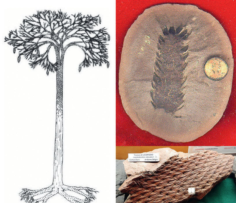 Каменноугольный лес кардинально отличался от современного. Зайдя в него, мы бы не встретили ни одного цветкового растения, ни одной елочки. Немногочисленные хвойные растения, представленные ныне вымершими вольциевыми (отдел Voltziales Andreanszky 1954), отдаленно напоминали секвойи и тополи, в то время как доминирующую роль в этом зеленом царстве играли папоротники (как споровые, так и семенные), хвощи и плауны. Причем современные представители этих групп не чета карбоновой родне. Самый известный представитель каменноугольных плаунов – лепидодендрон (Lepidodendron Sternberg, 1820) – достигал в высоту 50–55 м.